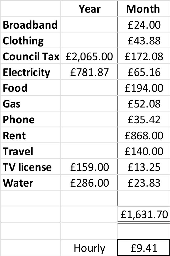 On an Excel Spreadsheet, I set out a list of all the key expenses that a single person would need to cover – without the added extras like holidays and big beer accounts. I looked up all the relevant figures for the average spend if you are a single person, and then did the maths to work out how much a single person on a basic, minimum or living wage needs to earn every hour, without deductions, to cover those costs, for themselves.