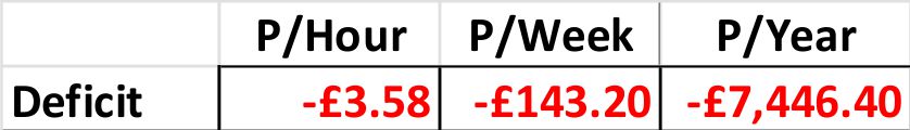 In basic terms, on National Minimum Wage today, set against the figures suggested here, you would be underpaid by £3.58 per hour, £143.20 per week, or by £7,446.40 per year.