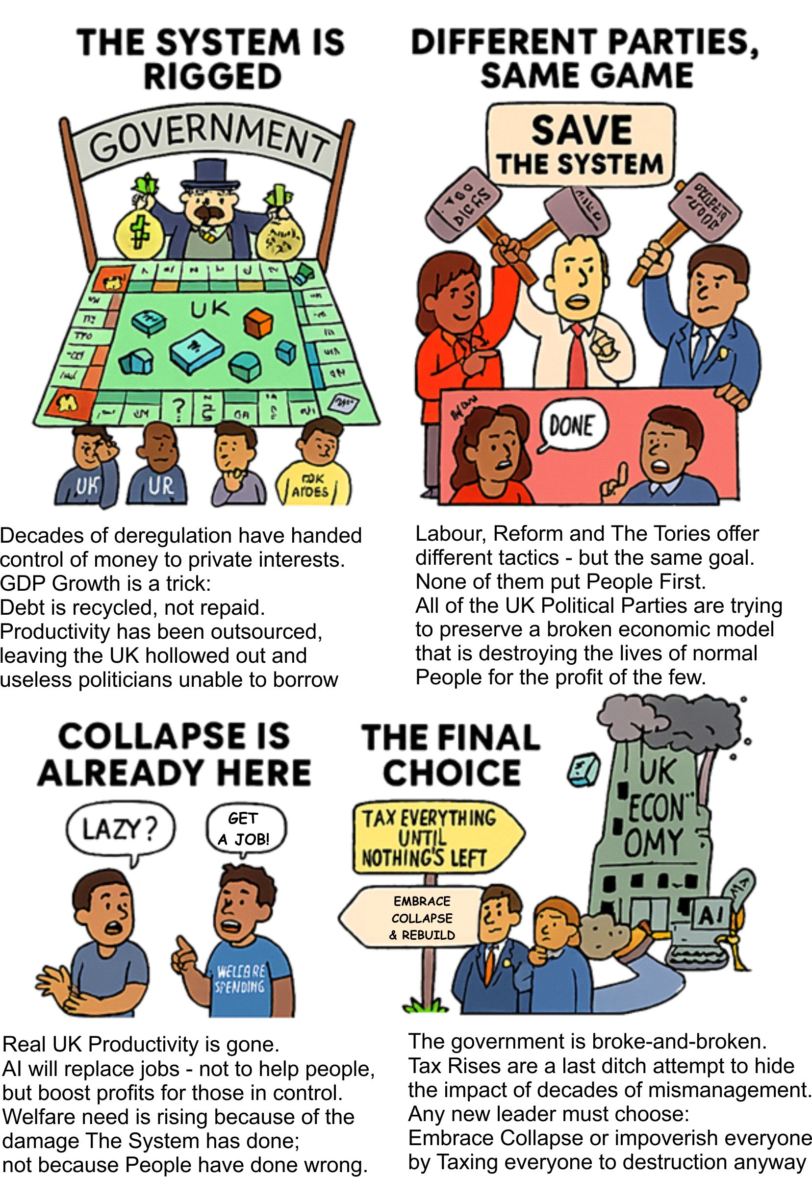 • The UK government is financially broken, and politicians are trapped between two bad options: accept collapse now or prolong it by taxing and impoverishing the public.